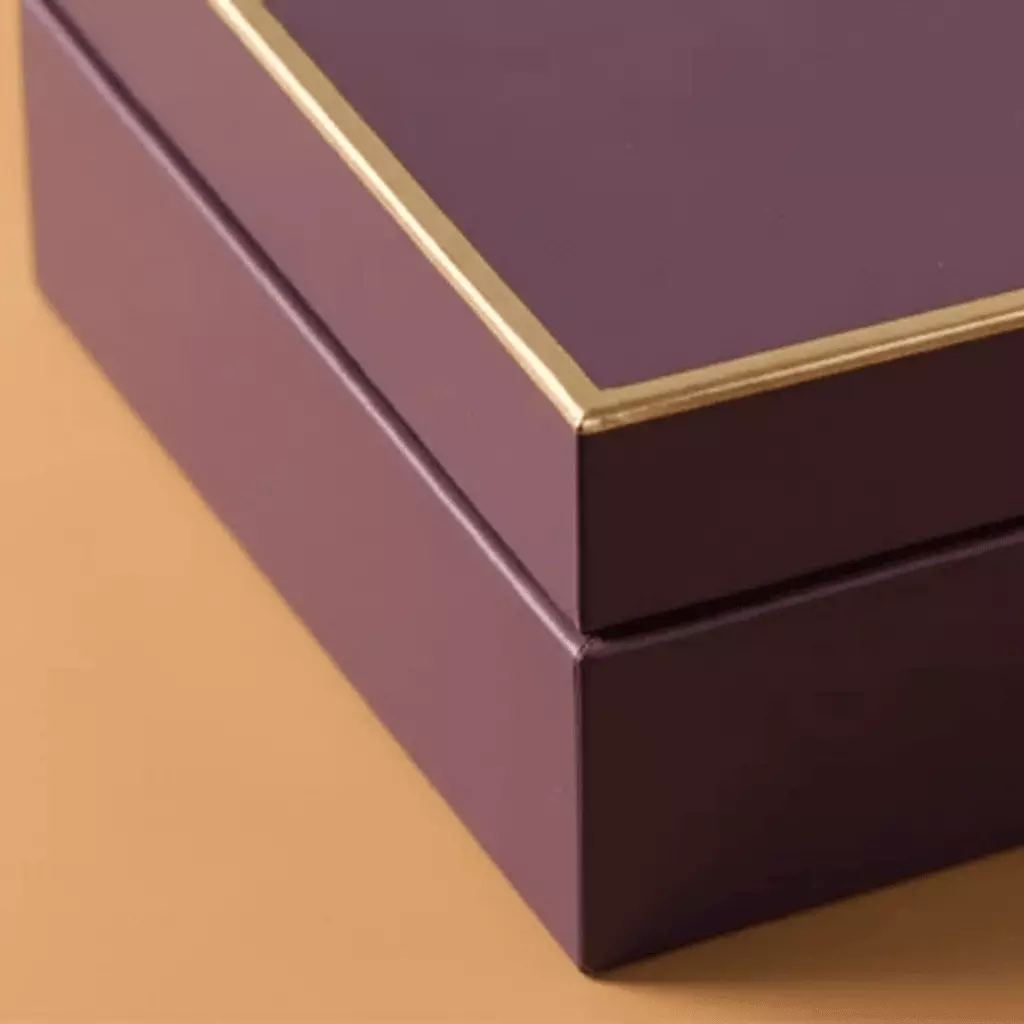 Metallic foil on box edges adds a rich, upscale frame to packaging
